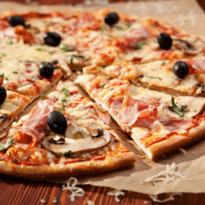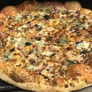 Délicieuse pizza fermière avec sauce tomate, poulet, champignon, origan.